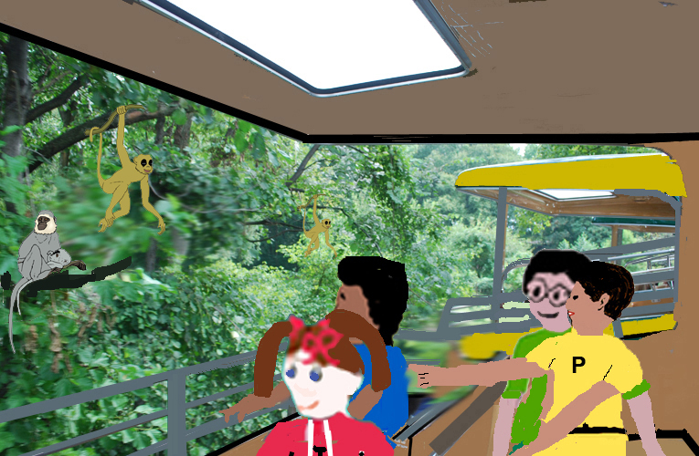 The friends rode on the monorail, it took them round and round. They saw some animals in the trees and many on the ground. Like different kinds of monkeys on the branches of the tree.